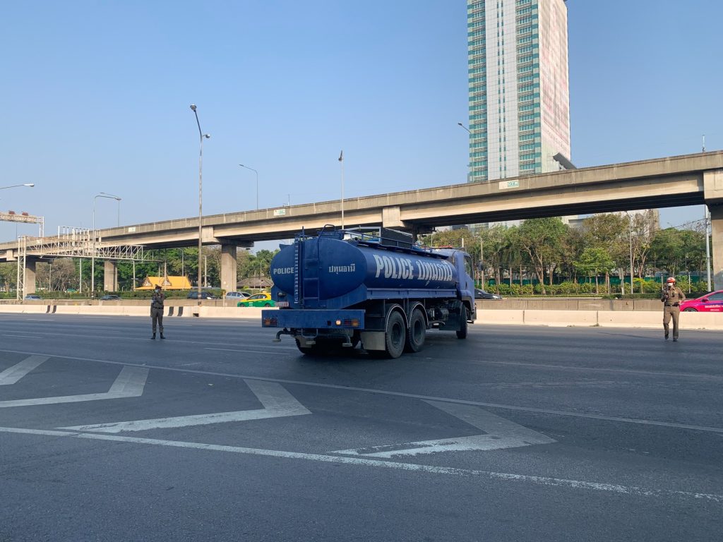 ตำรวจนำรถน้ำ 2 คันจอดคอยข้าง รพ.ทหารผ่านศึก รับ #ม็อบ28กุมภา