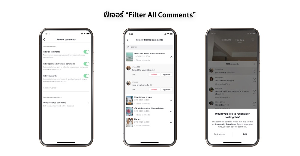 TikTok แพลตฟอร์มวิดีโอสั้นชั้นนำระดับโลก ถือเป็นแพลตฟอร์มที่ให้ความสำคัญกับการพัฒนาประสบการณ์บนแพลตฟอร์มในทุกด้าน โดยการดูแลสภาพแวดล้อมบนแพลตฟอร์มให้เป็นพื้นที่ ที่เป็นมิตรและปลอดภัยสำหรับผู้ใช้ ถือเป็นหนึ่งเป้าหมายที่ TikTok ให้ความสำคัญอย่างยิ่งนับตั้งแต่การเปิดตัวแพลตฟอร์ม ผ่านการพัฒนานโยบาย เทคโนโลยี และบุคลากรด้านความปลอดภัย โดยล่าสุด TikTok ได้เปิดตัว 3 ฟีเจอร์ด้านความปลอดภัย ได้แก่ “Know the Facts”, “Filter All Comments” และ “Rethink” ซึ่งถือเป็นฟีเจอร์ที่จะเข้ามาช่วยสร้างสรรค์สังคมดิจิทัลที่ปลอดภัยให้กับทุกคน