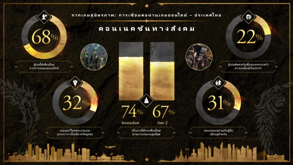 สำนักข่าวบริคอินโฟ – ผลสำรวจล่าสุดจาก YouGov ซึ่งได้รับการสนับสนุนโดย The Elder Scrolls Online (ESO) เปิดเผยว่า เกมออนไลน์กำลังเข้ามามีบทบาทสำคัญในการเป็นแพลตฟอร์มหลักเพื่อสร้างมิตรภาพและความสัมพันธ์สำหรับคนไทย โดยเฉพาะในกลุ่มคนรุ่นใหม่ โดยพบว่าเกมเมอร์ไทยมากกว่า 2 ใน 3 ได้เพื่อนใหม่ผ่านช่องทางออนไลน์ และยังเป็นช่องทางที่หลายคนใช้ติดต่อกับครอบครัวและเพื่อนมากกว่าการโทรศัพท์หรือวิดีโอคอล