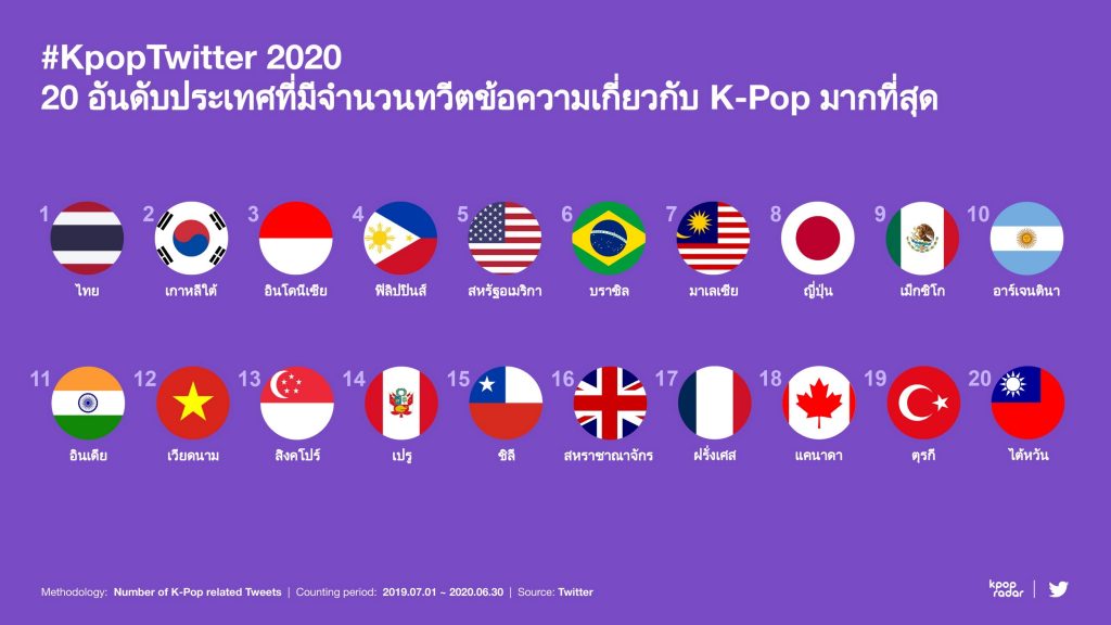 #KpopTwitter เป็นชุมชนระดับโลกอย่างแท้จริงเนื่องจากมีประเทศต่างๆ ทั่วโลกถึง 20 ประเทศที่มีความโดดเด่นในบทสนทนาที่เกี่ยวกับ K-Pop ติดอันดับมากที่สุด ครอบคลุมในทุกทวีปทั่วโลก (ข้อมูลตั้งแต่วันที่ 1 กรกฎาคม 2562 – วันที่ 30 มิถุนายน 2563) กระแสความนิยมของ K-Pop ภายในประเทศไทย ส่งผลให้ไทยจัดอยู่ใน 10 อันดับประเทศที่มีจำนวนผู้ใช้งานทวิตเตอร์ที่พูดถึง K-Pop มากที่สุดในโลก และยังครองแชมป์อันดับ 1 ประเทศที่มีการทวีตข้อความเกี่ยวกับ K-Pop มากที่สุดในโลกอีกด้วย