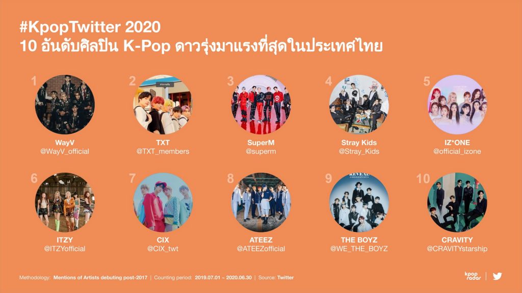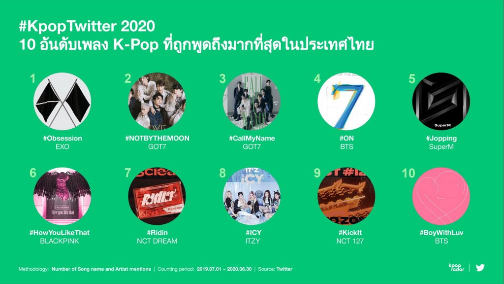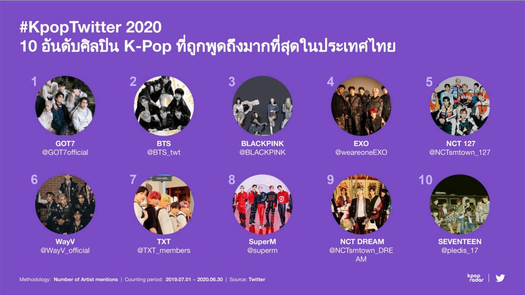 วง BTS เป็นศิลปินที่ถูกพูดถึงมากที่สุดในทุกตลาดทั่วโลก (ยกเว้นประเทศไทยที่วง GOT7 อยู่ในอันดับ 1) ส่วนอีก 10 อันดับของศิลปินที่ได้รับการพูดถึงมากที่สุดนั้นแตกต่างกันไปตามตลาดของแต่ละประเทศ ซึ่งแสดงให้เห็นถึงความหลากหลายในบรรดากลุ่มแฟนคลับ K-Pop บนทวิตเตอร์ทั่วโลก (ข้อมูลตั้งแต่วันที่ 1 กรกฎาคม 2562 – วันที่ 30 มิถุนายน 2563) และนับว่าเป็นครั้งแรกที่ ทวิตเตอร์จับมือกับ K-pop Radar ร่วมกันเปิดเผยข้อมูลเชิงลึกของ K-Pop ใน 20 ประเทศทั่วโลก โดยมีการจัดอันดับศิลปินที่ถูกพูดถึงมากที่สุด และ เพลงที่ได้รับการพูดถึงมากที่สุด (โดยวัดจากจำนวนทวีต) รวมถึงศิลปินดาวรุ่ง (วัดจากการเติบโตของจำนวนทวีตที่สูงที่สุด) บนทวิตเตอร์ในประเทศไทย (ข้อมูลตั้งแต่วันที่ 1 กรกฎาคม 2562 – วันที่ 30 มิถุนายน 2563)