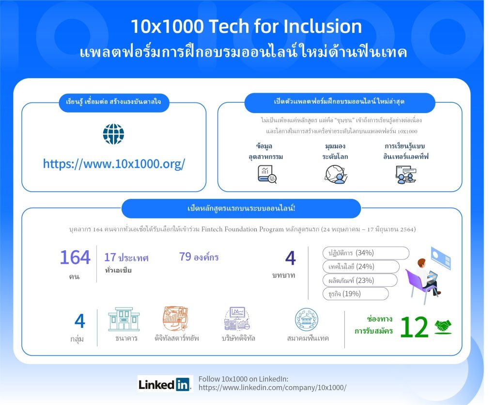 เมื่อวันที่ 24 พฤษภาคมที่ผ่านมา โครงการนี้ได้จัดการฝึกอบรมในหลักสูตรใหม่ FinTech Foundation Program โดยมีผู้เข้าร่วมลงทะเบียนกว่า 160 คนจาก 17 ประเทศในทวีปเอเชีย ดำเนินการผ่านระบบออนไลน์ โดยผู้สอนเป็นผู้เชี่ยวชาญด้านฟินเทคจากทั่วโลก ซึ่งสามารถปลูกฝังความคิดในการใช้เทคโนโลยี เพื่อลดปัญหาความเหลื่อมล้ำ และบ่มเพาะความเป็นผู้นำ ทั้งยังช่วยให้ผู้เรียนได้รับทราบข้อมูลเชิงลึกและแนวโน้มของอุตสาหกรรมอีกด้วย