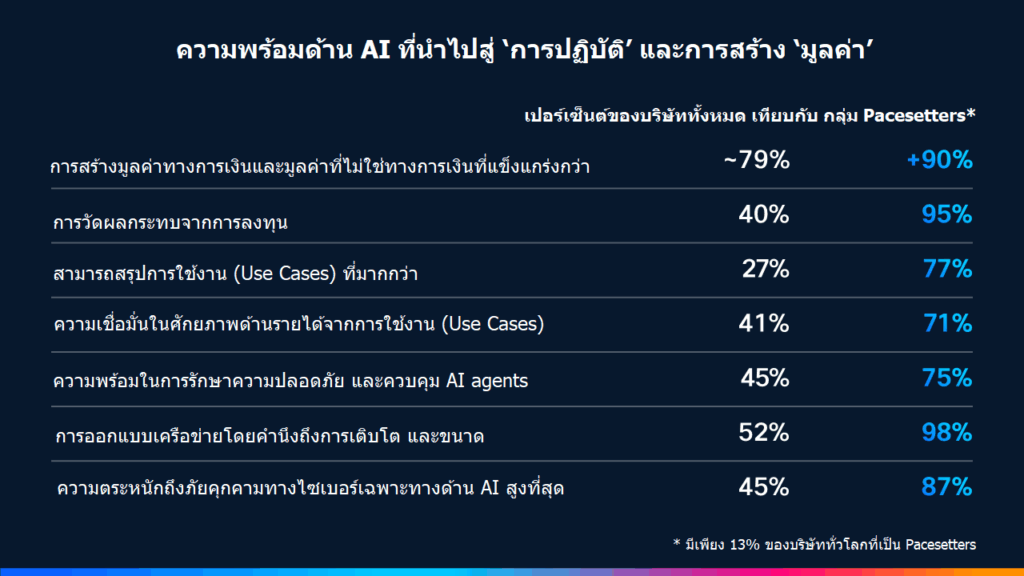 การวิจัยของ Cisco ยังระบุถึงลักษณะเด่นของกลุ่ม Pacesetters ที่สร้างผลตอบแทนทางธุรกิจอย่างสม่ำเสมอ โดยพวกเขามีการ ผนวก AI เข้าเป็นแกนหลักของธุรกิจ มีแผนงานด้าน AI ที่ชัดเจน (99% เทียบกับ 73% ในประเทศไทย) และมีกลยุทธ์การจัดหาเงินทุนระยะสั้นและระยะยาว (96% เทียบกับ 55% ในประเทศไทย) พวกเขายัง สร้างโครงสร้างพื้นฐานที่พร้อมสำหรับการเติบโต โดย 71% ของกลุ่มนี้ระบุว่าเครือข่ายของพวกเขามีความยืดหยุ่นอย่างเต็มที่และสามารถขยายได้ทันทีสำหรับโครงการ AI (เทียบกับ 27% ในประเทศไทย) นอกจากนี้ กลุ่มผู้นำยัง สามารถนำร่องโครงการไปสู่การใช้งานจริงได้สำเร็จ โดย 77% ได้ทำโครงการใช้งาน AI เหล่านั้นเสร็จสมบูรณ์แล้ว (เทียบกับ 27% ในประเทศไทย) และ 95% มีการติดตามผลกระทบจากการลงทุนด้าน AI ซึ่งสูงกว่าองค์กรอื่นๆ มากกว่าสองเท่า