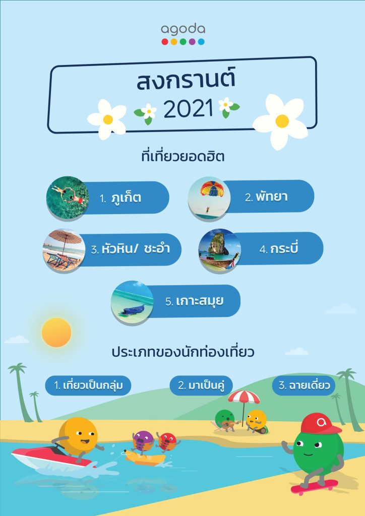 ข้อมูลการจองห้องพักของอโกด้า แพลตฟอร์มดิจิทัลด้านการเดินทางท่องเที่ยวระดับโลก (http://www.agoda.com/?site_id=1811392&cid=-1) เผยให้เห็นว่า ที่พักริมทะเลเป็นตัวเลือกที่ครองใจคนไทยช่วงสงกรานต์ นอกจากนี้คนไทยยังจองที่พักที่อยู่ในระดับที่หรูหราขึ้นในช่วงวันหยุดสงกรานต์ปี 2564
