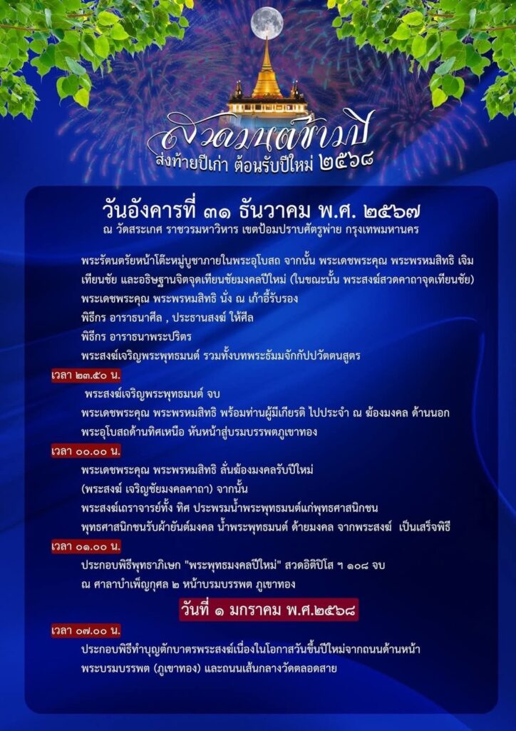 วัดสระเกศ ราชวรมหาวิหาร ขอเชิญชวนพุทธศาสนิกชน ร่วมกิจกรรมสวดมนต์ข้ามปี เสริมสิริมงคลรับปีใหม่ 2568 พร้อมสัมผัสบรรยากาศแห่งศรัทธา และความงดงามของวิถีไทย ณ วัดสระเกศ ราชวรมหาวิหาร