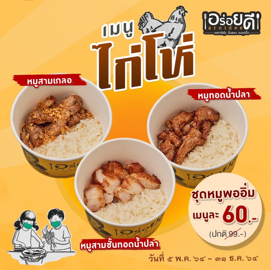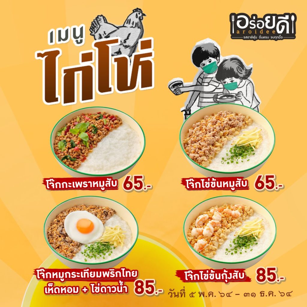 ใครๆ ก็รู้ว่ามื้อเช้าสำคัญมากๆ ร้าน “อร่อยดี” เตรียมความพร้อม เสิร์ฟความอร่อยให้ทุกท่าน ตั้งแต่ยามเช้าของวัน ด้วยสารพัดเมนูยอดนิยม ที่สร้างความอิ่มอร่อย อุ่นท้อง แถมราคาพิเศษเบาใจ ช่วงโควิดให้ผ่านไปด้วยกัน …. เริ่มต้นยามเช้ากับร้านอร่อยดีด้วย “เมนูไก่โห่” เตรียมพร้อมเสิร์ฟให้ลูกค้าเลือก คัดสรรเมนูเด็ดจาก 3 ร้านดัง #อร่อยดี #เจ๊เกียงหมูทอดข้าวเหนียวนุ่ม #เจ๊เกียงโจ๊กกองปราบ ผนึกกำลัง ยกขบวนเมนูยอดนิยม ควรค่าแก่การหม่ำในตอนเช้า อาทิ แกงจืดเต้าหู้หมูสับ + ข้าวสวย ราคา 79 บาท (ปกติ 109 บาท) โจ๊กไข่ข้นหมูสับ 65 บาท โจ๊กกะเพราหมูสับ 65 บาท โจ๊กไข่ข้นกุ้งสับ 85 บาท โจ๊กหมูกระเทียมพริกไทยเห็ดหอม+ ไข่ดาวน้ำ 85 บาท โจ๊กเครื่องใน 55 บาท โจ๊กหมู 45 บาท โจ๊กเด็ก 30 บาท โจ๊กเปล่า 20 บาท