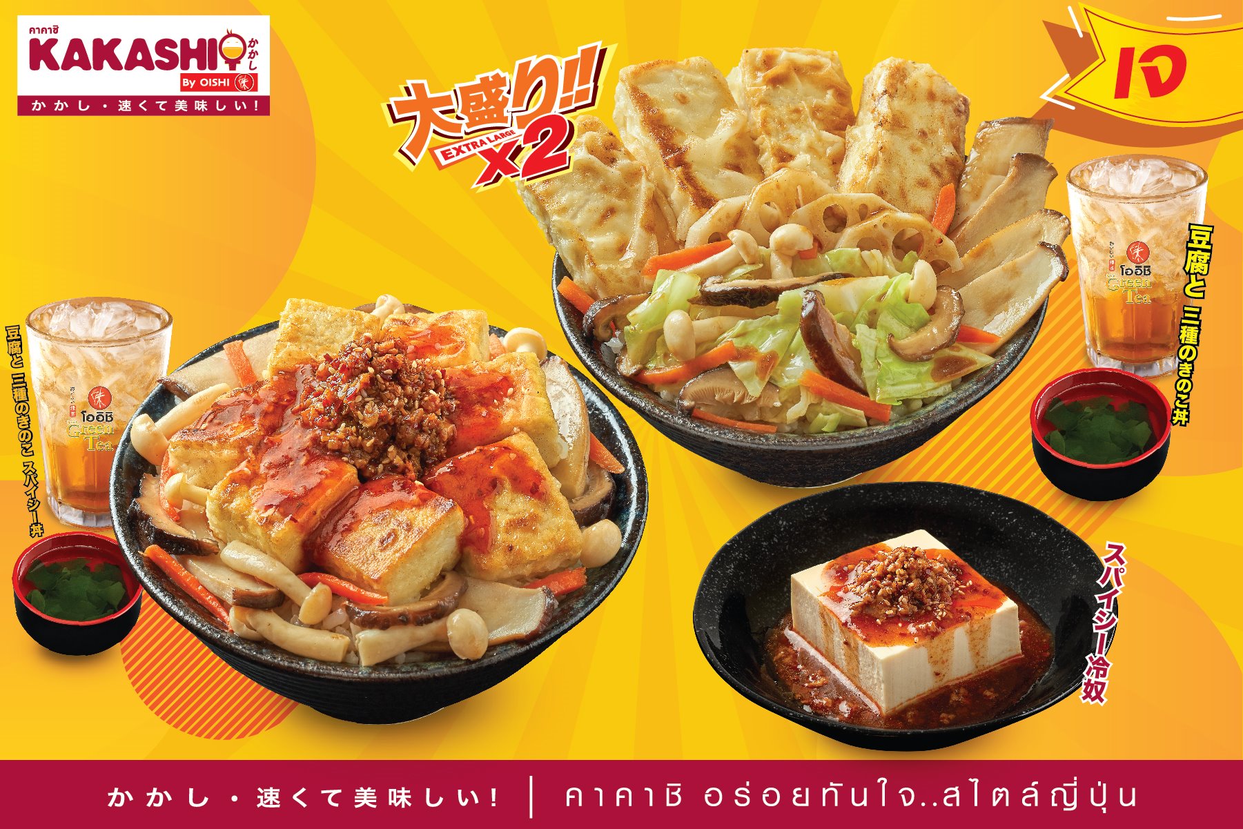 ตามมาด้วย คาคาชิ (KAKASHI By OISHI) นำเสนอชุดเมนูอาหารเจในรูปแบบของดงบุริ (หรือข้าวหน้าต่าง ๆ) ที่มาพร้อมกับ 2 รสชาติที่แตกต่างกัน ทั้ง ข้าวหน้าล้นเต้าหู้เห็ดรวม รสชาติเบา ๆ กลมกล่อม…กำลังดี และ ข้าวหน้าล้นเต้าหู้เห็ดรวมสไปซี่ รสชาติเผ็ด…จัดจ้าน พิเศษ !!! จัดเสิร์ฟเป็นชุด พร้อมน้ำซุปเจร้อน ๆ 1 ถ้วย และน้ำชาเขียว โออิชิ กรีนที 1 แก้ว ในราคาสุดคุ้ม เพียงชุดละ 159 บาท เท่านั้น