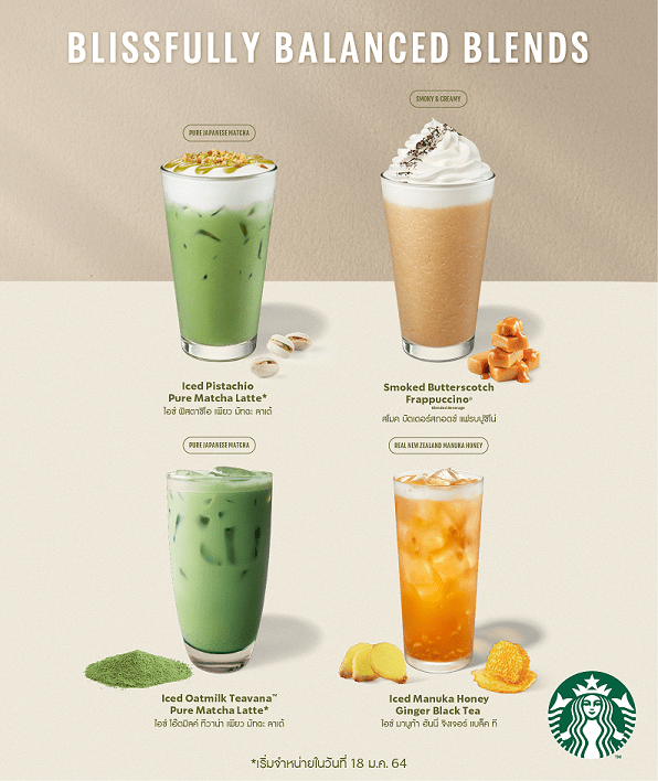 สตาร์บัคส์ ประเทศไทย ต้อนรับปีใหม่กับเครื่องดื่มใหม่ ในคอนเซ็ปต์ “Blissfully Balanced Blends” ให้ลูกค้าได้รื่นรมย์กับเครื่องดื่มที่ผสมผสานวัตถุดิบจากธรรมชาติ ได้แก่ มานูก้า ฮันนี่ จินเจอร์ แบล็ค ที เครื่องดื่มชาอิงลิชเบรกฟาสต์ ผสานกับน้ำผึ้งมานูก้าจากนิวซีแลนด์ ที่ขึ้นชื่อว่าเป็นหนึ่งในน้ำผึ้งที่ดีที่สุดในโลก พร้อมประโยชน์ทางสุขภาพ เพิ่มความหอมจากกลิ่นของขิง โดยมีให้เรื่องทั้งแบบร้อนและเย็น และ สโมค บัตเตอร์สก็อตซ์ ลาเต้ เครื่องดื่มยอดนิยมของร้านสตาร์บัคส์ รีเสิร์ฟ โรสเตอรี่ ที่เซี่ยงไฮ้ ที่นำช็อตเอสเพรสโซ่ซึ่งเป็นซิกเนเจอร์ของสตาร์บัคส์ ผสมเข้ากับนมและซอสบัตเตอร์สก็อตหอมหวาน มีให้เลือกทั้งแบบร้อน เย็น และปั่น ทั้งนี้ เครื่องดื่มทั้งสองรายการจะเริ่มจำหน่ายในวันที่ 7 มกราคม – 22 กุมภาพันธ์ 2564 ที่ร้านสตาร์บัคส์ทุกสาขาทั่วประเทศ
